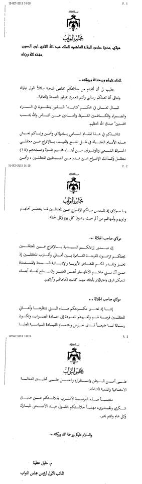 وجه النائب الأول لرئيس مجلس النواب خليل عطية رسالة الى مقام جلالة الملك عبدالله الثاني ابن الحسين جاء فيها :